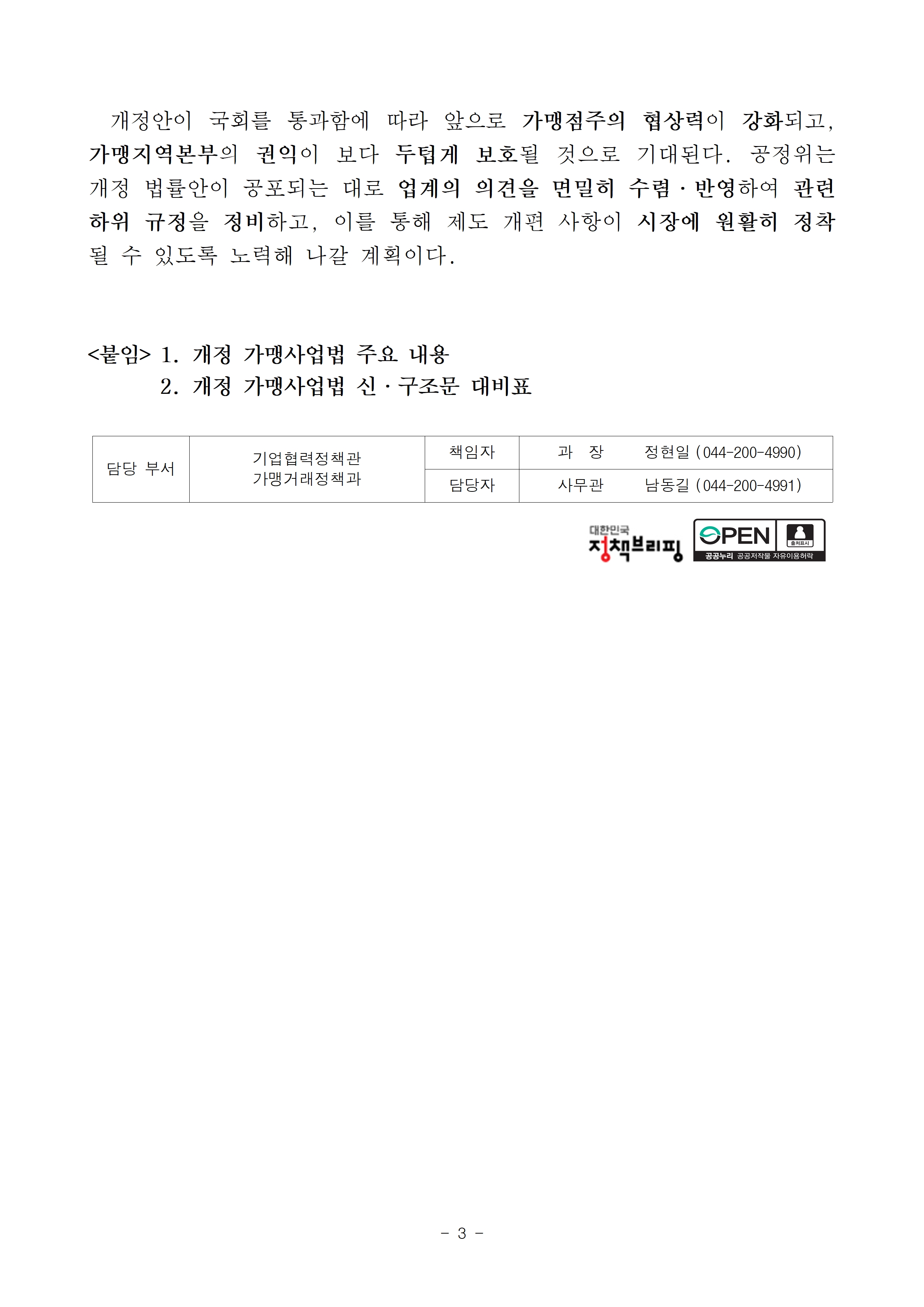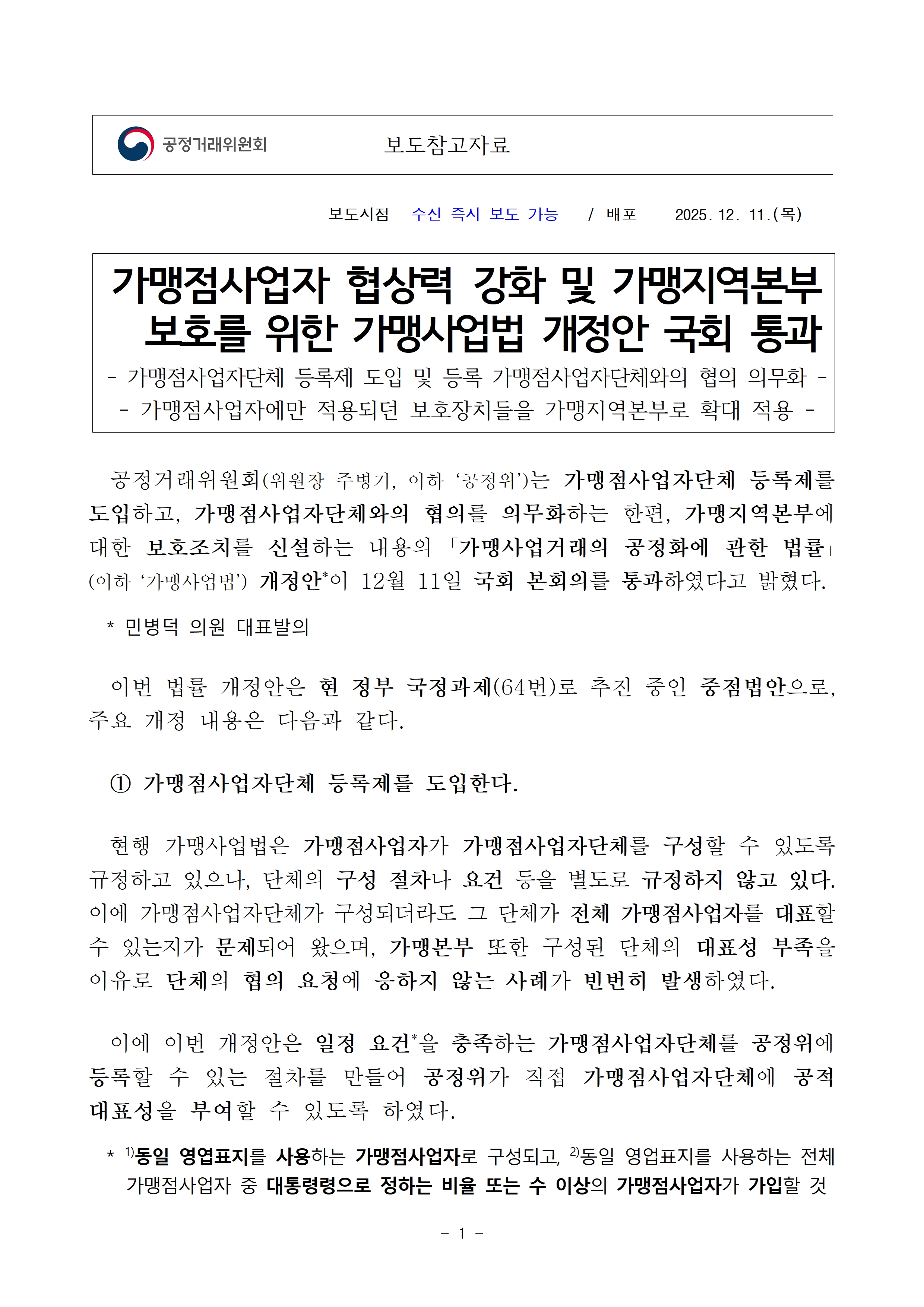 [공정위] '25.12.11.자 가맹사업법 개정안 관련 보도자료 및 주요 내용