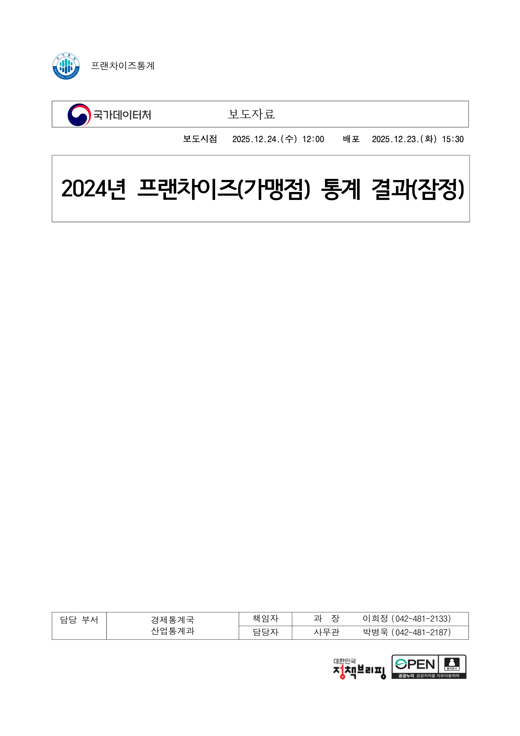 [국가데이터처] 2024년 프랜차이즈(가맹점) 통계 결과(잠정) 보도 25.12.24
