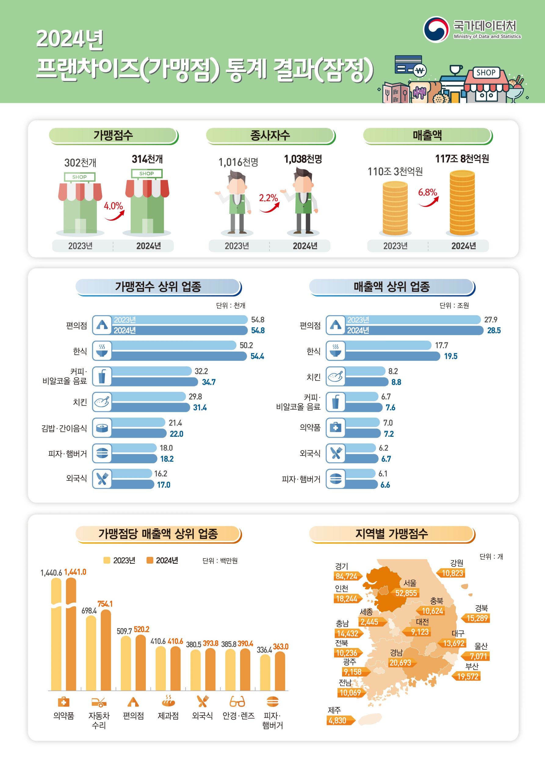 국가데이터처에서 발표한 2024년 프랜차이즈(가맹점) 통계 결과(잠정) 보도자료입니다.